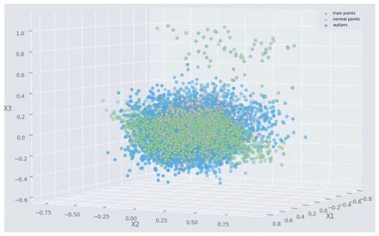 Figure 10 illustrates the OC SVM algorithm’s results in filtering potential flood points, where green points denote known flood samples, and blue points indicate non-flood samples with environmental characteristics that differ substantially from flood samples. Red sample points, having environmental factor values similar to known flood samples, are potential flood points within the non-flood sample dataset. The OC SVM algorithm increases the accuracy of the non-flood dataset by learning environmental characteristics from flood points, thereby excluding potential flood points (red points) and identifying potential non-flood points (blue points) within the dataset.