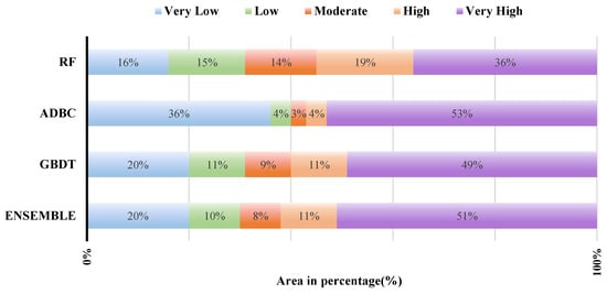 Percentage of flood susceptibility levels for different models: Random Forest (RF); Adaptive Boosting (ADBC); Gradient Boosting (GBDT); stacking (NSEMBLE).