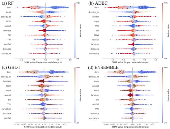 Summary and importance plot of the features derived from SHAP values for different models: (a) Random Forest (RF); (b) Adaptive Boosting (ADBC); (c) Gradient Boosting (GBDT); (d) stacking (NSEMBLE).