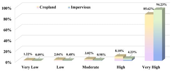 Agricultural and built-up land types are crucial to human life and are more likely to lead to flood disasters [67,68]. Therefore, this study analyzed the relationship between flood susceptibility levels in the ENSEMBLE flood susceptibility map and the factors of agricultural and built-up land use in the land use type influencing factors (Figure 14). The results indicate that the proportion of agricultural and built-up land areas in high susceptibility levels have the largest, at 85.6% and 94.2%, respectively, while in very low susceptibility areas, the proportion is only 1.2% and 0.1%. The smaller the proportion of agricultural and built-up land area, the lower the flood risk. The higher the footprint of cultivated land and building land, the higher the susceptibility level, and the higher the impact on flood occurrence to some extent, consistent with previous research results [69]. Cultivated and built-up land is mostly located at lower elevation. Therefore, in this study, we carried out a further analysis of the effects of low elevation and cropland and building land on flood vulnerability. The distribution of elevation of cropland and building land among land use types in the study area was analyzed, and it was found that cropland was located at an average elevation of 393.73 m and building land was located at an average elevation of 236.26 m, which were in the low elevation area. Elevation is a significant factor influencing the occurrence of flooding, and in low elevation areas, areas of cropland and built-up land further exacerbate the likelihood of flooding. Therefore, due to the influence of agricultural and built-up land area proportions in the Zijiang River Basin, the area proportions of extremely low and extremely high flood susceptibility in the study area exhibit an extreme distribution trend.