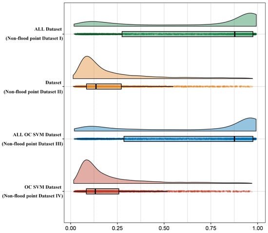 In order to further analyze the impact of non-flood sample selection methods on flood susceptibility simulation results, this study used cloud–rain maps to analyze the distribution of predicted values of different non-flood samples in the integrated model (Figure 15). Non-flood sample datasets I and III produced higher flood susceptibility prediction values, with a median of 0.87. Based on the frequency ratio algorithm to determine the non-flood sample selection range (datasets II and IV), the flood susceptibility prediction values of non-flood samples selected within the range were mainly lower than 0.2. Moreover, the flood susceptibility prediction value of non-flood samples dataset IV selected by the OC SVM algorithm was the lowest. This shows that the non-flood point extraction range determined by the frequency ratio algorithm and the non-flood samples selected by the OC SVM algorithm are of higher quality, which can better reflect the spatial location distribution of non-floods and improve the accuracy of model simulation.