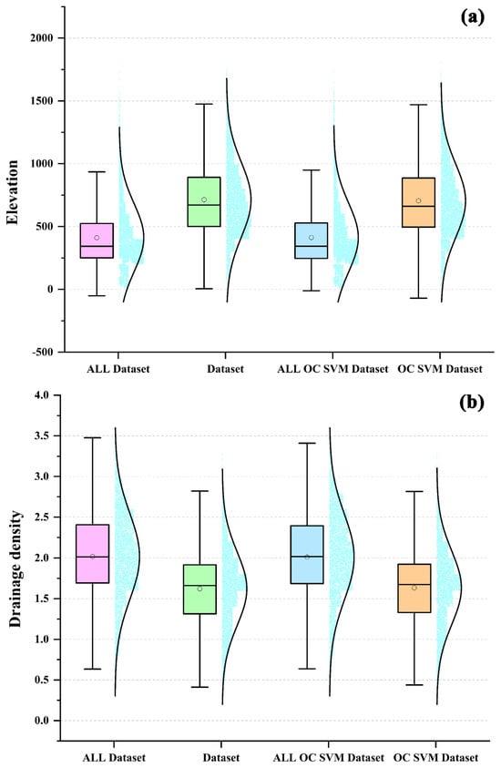 The box plots of non-flood points are based on elevation (a) values and drainage density (b).
