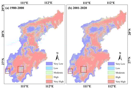 In order to dynamically reflect the spatial distribution of flood susceptibility in the Zijiang River Basin, the study selected land use type data in 2000 and 2020 to characterize land use type changes and used multi-year average rainfall data from 1980 to 2000 (before 2000) and 2001 to 2020 (after 2000) to characterize climate change. The optimal non-flood point dataset and the constructed ENSENMBLE integrated model were used to simulate the flood susceptibility map of the Zijiang River Basin before and after 2000 (Figure 17). The simulation accuracy of the ENSENMBLE model before and after 2000 is 0.94 and 0.95, respectively, indicating high accuracy and reliable simulation results. In order to compare and analyze the changes in flood susceptibility levels in the Zijiang River Basin in two periods, this study used the same classification interval to classify the susceptibility results, taking the natural break point classification interval of the flood susceptibility results before 2000 as the standard.