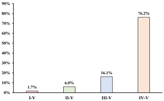 It can be clearly seen from Figure 17 that the flood susceptibility in the southwest of the Zijiang River Basin increased significantly after 2000. By comparing and analyzing the changes in flood susceptibility risk levels before and after 2000, it is found (Figure 18) that the area that changed from level IV (high flood susceptibility risk level) before 2000 to level V (very high flood susceptibility risk level) after 2000 accounted for as high as 76.2%. The areas where the flood susceptibility levels of level III (moderate flood susceptibility risk level), level II (low flood susceptibility risk level), and level I (very low flood susceptibility risk level) changed to level V accounted for 16.1%, 6.0%, and 1.7%, respectively.