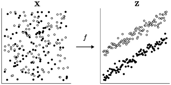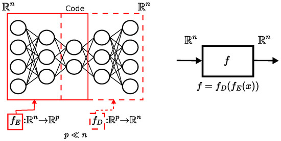 The aim of the AEs, formally defined in [65], is to learn the functions and , where denotes the encoder function, is the decoder function, n is the dimension of the input and output spaces and p denotes the dimension of the code space. Generally, , leading to the learning of the compressed features of the data.