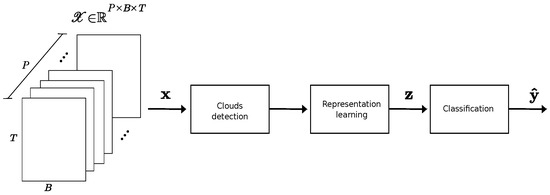 Given the multi-spectral time series, a scene classification product (e.g., ESAs sen2cor) is used to obtain a cloud/non-cloud mask for each sample , i.e., for each temporal observation at the pixel level. Cloudy samples are excluded from the dataset. This creates a set of pixels with a variable number of cloud-free (temporal) observations. Only the cloud-free observations of a pixel are used as inputs to generate a representations vector. This makes our model flexible and independent with regard to the number of clear observations.