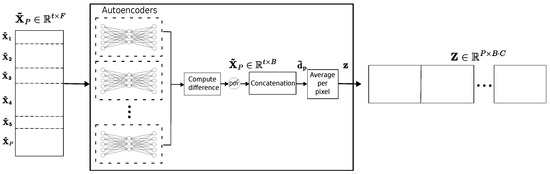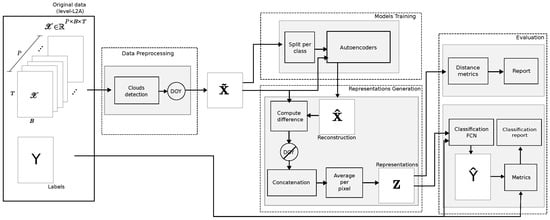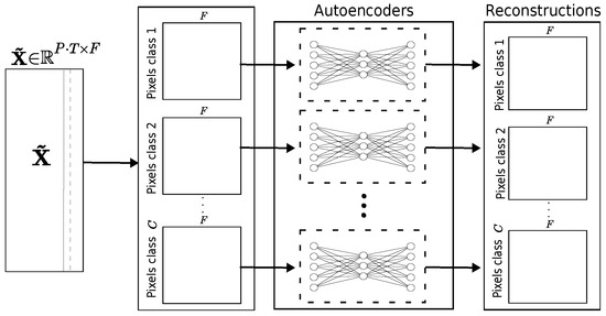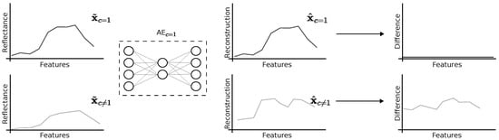 The principle of this work is to train a set of C independent AEs with vectors , which are individual time-tagged spectral signatures of cloud-/shadow-free observations that belong to a particular class c for , resulting in C semi-supervised trained models able to reconstruct samples from the same class, bringing the reconstruction difference towards the zero vector, while using the ensemble of reconstruction difference vectors to derive the representations (see Figure 6).