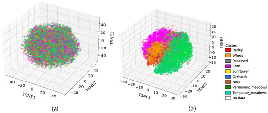 The batch size, learning rate, number of units in the hidden layer and loss function were set in accordance with the results acquired through the hyperparameter random search presented in Appendix A. The split of the dataset is described in Table 4, which outlines the features employed in this experiment. These include DOY (sine and cosine), 10 spectral bands (10 and 20 m resampled to 10 m) and five well-known spectral indices: the normalized difference water index (NDWI), normalized difference vegetation index (NDVI), normalized difference tillage index (NDTI), normalized difference of senescent vegetation index (NDSVI) and enhanced vegetation index (EVI). Table 5 presents the AEs’ configuration.