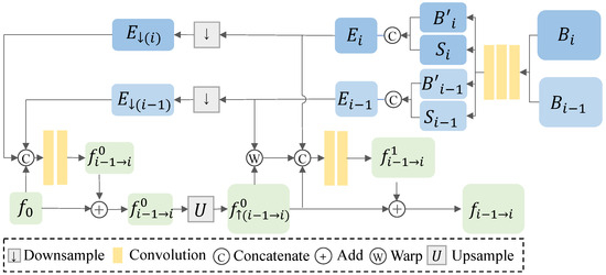 To estimate weak motion between consecutive frames and refine the optical flow predicted from the lower-resolution frames, the coarse flow is firstly upsampled to the original scale via bilinear interpolation U. Then, we warp feature with optical flow and obtain feature map .