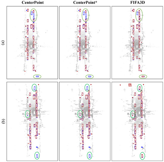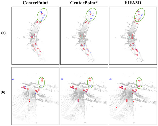 Qualitative results on the Waymo dataset in rural (a) and highway-like (b) scenarios. Blue boxes denote ground truth, and red boxes denote the predictions. Green ovals represent objects that FIFA3D successfully detected but the other two methods failed to detect. * represents using 2-frame point clouds concatenation as input.