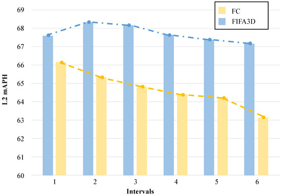 To further demonstrate the ability of FIFA3D to model temporal correlations, we conducted the following experiments: both the feature concatenation method and our FIFA3D were first trained with two consecutive frames in intervals of one, and then we evaluated them with two-frame point clouds at different intervals. As illustrated in Figure 8, as the interval increased, the accuracy of the feature concatenation method showed a clear downward trend, whereas our method showed a slower performance drop and surprisingly obtained the best result with an interval of two. This phenomenon indicates that our method is comparatively more flexible and is capable of dealing with arbitrary intervals although it was trained with a fixed one. Meanwhile, the result suggests that choosing appropriate frame intervals could maximize the information variability in sequential point clouds and consequently improve performance.
