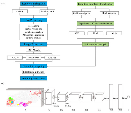 CNN algorithms have been developed into frameworks for image classification, demonstrating good performance in handling data with local correlations. These algorithms can directly train multi-dimensional remote sensing images, which minimize the loss of original data during information extraction, and thereby enhance the learning and generalization capacity of the models [14,17,18,19]. In this study, we used three models of AlexNet, VGGNet, and GoogLeNet (Figure 3a). These three models display the advantages of having a simple structure, low model complexity, low overfitting risk, and abundant extraction features, which provide more information for the identification of granite lithology. Compared with the other two models, the AlexNet model can automatically extract features from images through alternating stacking of convolutional layers and max-pooling layers.