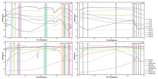 Reflectance spectra of rock samples from the Western Junggar region (a). Resampled spectra of rock samples to ASTER VNIR-SWIR bands (b). Reflectance spectra of related minerals (from the USGS spectral library) (c). Resampled mineral spectra to ASTER VNIR-SWIR bands (d).
