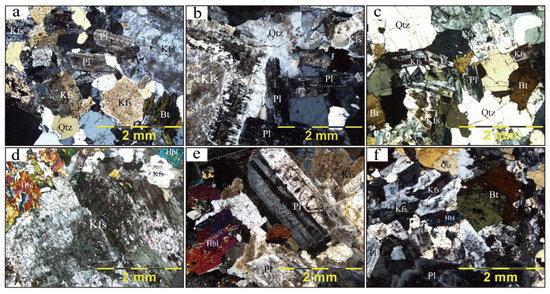 For the samples from the Karamay intrusion: KII-02 is a plagiogranite, consisting of quartz (~30 vol%), plagioclase (~40 vol%), K-feldspar (~15 vol%), and hornblende (<5 vol%; Figure 5e). Sample KIII-01 is biotite granite, composed mainly of quartz (~20 vol%), plagioclase (~20 vol%), K-feldspar (~30 vol%), biotite (~15 vol%), and minor hornblende (<5 vol%; Figure 5f).