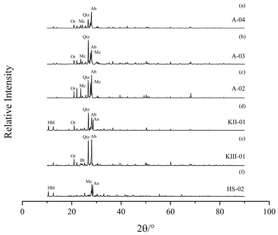 The granitoid samples were milled and analyzed with a Rigaku SmartLab X-Ray powder diffractometer (XRD) (Rigaku cooperation, Tokyo, Japan). As shown in Figure 6, alkali granite sample A-02 shows prominent diffraction peaks at 26.7° for quartz, 27.9° for albite, and 27.5° for microcline, alongside a weaker peak at 20.9° for orthoclase. Different from A-02, monzogranite sample A-03 shows a weaker albite (27.9) but stronger quartz (26.7) peak, and a distinct peak of microcline (27.5). Sample A-04, characterized by significant fracturing and weathering, shows a strong albite peak at 27.9° and a weaker quartz peak at 26.7°, accompanied by weak orthoclase and microcline peaks. Plagiogranite sample KII-01 shows prominent peaks at 26.7° (quartz), 27.9° (albite), and 28.5° (anorthite), with weaker peaks for orthoclase and hornblende at 10.6°. Biotite granite sample KIII-01 exhibits strong peaks at 26.7° (quartz) and 27.9° (albite), with weaker peaks at 20.9° (orthoclase) and 26.4° (biotite). Coarse-grained alkali granite sample HS-02 shows strong peaks at 27.5° (microcline) and 28.5° (anorthite), and a weaker peak for hornblende.