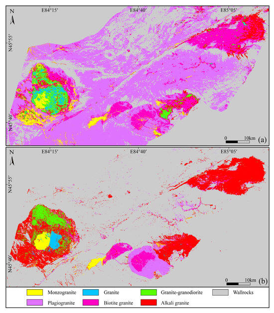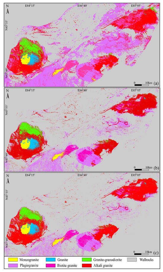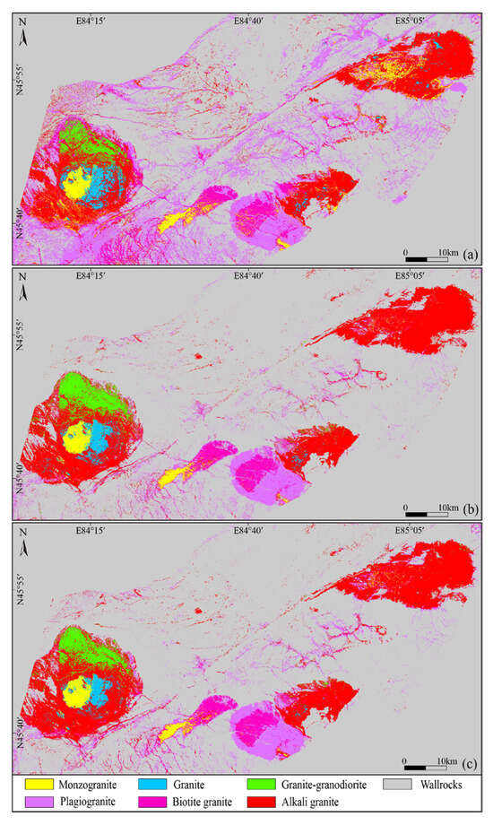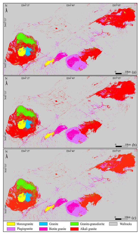 The lithological mapping results (with SWIR + T1 as input) for the AlexNet model are better than those of VGG16 and GoogLeNet, with considerably fewer misclassified pixels (Figure 8). The misclassification rate of wallrock in the study area is 13.6% of AlexNet, 17.3% of VGG16, and 43.8% of GoogLeNet, respectively. However, none of the three models can clearly define the granite–alkali granite boundary. All the models perform well in distinguishing monzogranite from the other granitoid subclasses. For the KI intrusion, the VGG16 and AlexNet models perform better than the GoogLeNet model, with fewer misclassified pixels as granite–granodiorite on the northern margin. For the KII intrusion, the results of the VGG16 and AlexNet models also show a clear plagiogranite–biotite granite boundary. For the KIII intrusion, the AlexNet model performs the best, with clear boundaries between granitoids, monzogranite, and biotite granite. For the Hongshan and Akebasito intrusions, the AlexNet model performs better in identifying granitoid subclasses, with only a few alkali granite pixels misclassified as plagiogranite. Compared with the GoogLeNet model, the VGG16 and AlexNet models also show a significant reduction in misclassified wallrocks (more gray coverage), primarily in the southern part of the Akebasito intrusion.