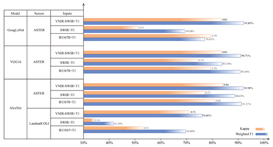 Comparing the overall classification accuracy from the ASTER data (Figure 11), the AlexNet model demonstrates superior performance across different inputs. For B13678 + T1, the AlexNet model achieves the highest weighted F1 score (91.21%) and kappa coefficient (0.81), outperforming the GoogLeNet model (F1 score = 76.65%; kappa coefficient = 0.79), as well as the VGG16 model (F1 score = 90.46%; kappa coefficient = 0.79). This trend is consistent with the results of SWIR + T1, where the AlexNet model achieves the highest weighted F1 scores and kappa coefficients. Specifically, the AlexNet model from ASTER VNIR-SWIR + T1 input leads again in the F1 score (91.98%) and kappa coefficient (0.84), closely followed by the GoogLeNet model (91.98%, 0.83) and then by the VGG16 model. Meanwhile, the AlexNet model from Landsat 8 VNIR-SWIR + T1 input achieves the highest overall weighted F1 score (76.06%) and kappa coefficient (0.71), which are much lower than those of the ASTER data. This further indicates that SWIR bands can provide more abundant and diagnostic imagery information for granitoid identification.