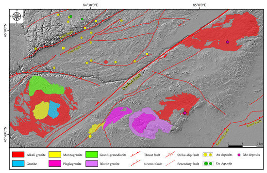 Lithological mapping of granitoids overlain by faults and ore deposits in the Western Junggar Orogen.