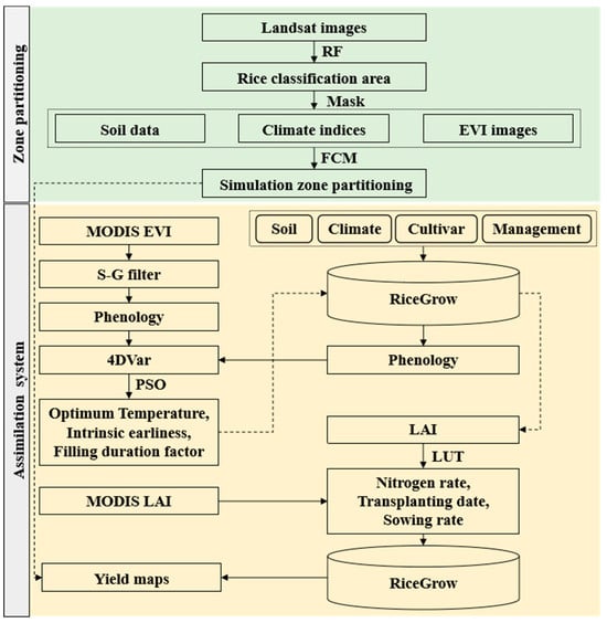 The purpose of this study was to (1) explore a simulation zone partitioning method that comprehensively considers climate suitability, vegetation index, and soil nutrient indicators; (2) develop a hierarchical assimilation based on simulation zone partitioning and dual variable to achieve the high precision prediction of rice yields at the regional scale.