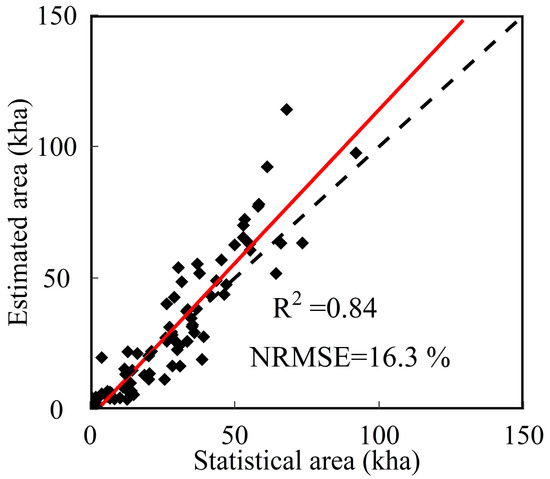 The spatial distribution map of the rice planting areas during 2015 in Jiangsu Province extracted by the remote sensing images is shown in Figure 3. Relatively speaking, the rice planting areas in the northern and central region of Jiangsu Province were more concentrated and the distribution range was wider, while the planting plots in the southern region were more fragmented and the distribution was less. We evaluated the accuracy of the rice planting area classifications by comparing them with the statistical data at the county scale. The results showed that the classification result was in good agreement with the statistical areas, while R2 and NRMSE were 0.84 and 16.3%, respectively (Figure 4).
