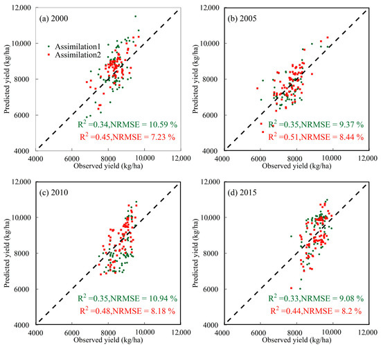 In this study, we used statistical yield data at the county scale to assess the performance of different assimilation systems. The results show that the R2 between the simulated yield and statistical data of Assimilation1 in 2000, 2005, 2010, and 2015 ranged from 0.33 to 0.35, and the NRMSE ranged from 9.08 to 10.94 % (Figure 6). Relatively speaking, the R2 between the simulated yield and statistical data of Assimilation2 ranged from 0.44 to 0.51, and the NRMSE ranged from 7.23 to 8.44%. Compared with Assimilation1, the R2 between the simulated yield of Assimilation2 and statistical data in 2000, 2005, 2010, and 2015 increased by 0.11, 0.16, 0.13, and 0.11, respectively. Meanwhile, the NRMSE decreased by 3.36%, 0.93%, 2.76%, and 0.88%, respectively. Assimilation2 was a better prediction model of rice yield. The rice yield maps in Jiangsu Province at the pixel scale were further generated based on Assimilation2 and simulation zone partitioning (Figure 7). In terms of the spatial distribution characteristics of the AE between the predicted yield and the statistical yield at the county scale, Assimilation2 well captured the heterogeneity of the spatial distribution for rice yield, and the AE between the predicted yield and the statistical yield at the county scale was roughly between −500 and 1000 kg/ha (Figure 8). In general, the predicted yield of Assimilation2 was in good agreement with the statistical data.