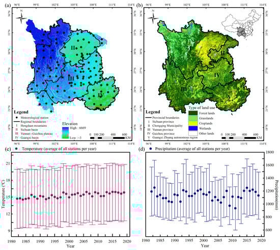 Distribution of elevation, and meteorology station and land cover types in SWC, with data on mean annual temperature and annual precipitation at meteorological stations. (a) Distribution of elevation and meteorological stations in south-western China, with regional divisions according to geographical relief. (b) Vegetation cover in south-western China and administrative boundaries. (c) Annual mean temperature at each station and standard deviation between stations from 1982 to 2019. (d) Total annual precipitation at all stations and standard deviation between stations from 1982–2019.