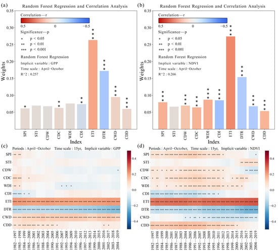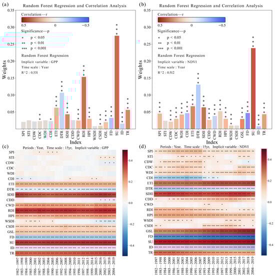 The analysis revealed both the weight and the correlations of various climate indices with the EIs. The weight and correlation of these indices with the GPP (Figure 2a) and NDVI (Figure 2b) were analyzed using a combination of random forest regression and a correlation analysis. Among the indices, SU (+) emerged as the most important for the GPP, with a weight of 0.275, followed by the RDI (+) and DTR (−), with weights of 0.153 and 0.107, respectively (‘+’ or ‘−’ represents a positive or negative correlation between the climate index and EIs). These indices not only had a higher weight in terms of their influence on the GPP, but also showed a extremely significant correlation (p < 0.001). While most ECIs were significantly correlated with the GPP, standardized indices and CECIs did not exhibit significant correlations, with the exception of the CDC (+, p < 0.01). Other indices, such as the WDI, CDD, and WSDI, were found to be neither important nor relevant to the GPP. A similar pattern was observed for the NDVI, with SU (+, p < 0.001) and DTR (−, p < 0.001) showing greater importance, with weights of 0.238 and 0.130, respectively. All indices except for the STI and CSDI were extremely significantly correlated with the NDVI (p < 0.001).