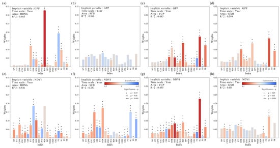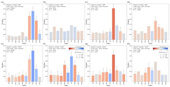 Weights and correlation of ECIs with EIs across different regions of SWC (annual scale). (a–d) display the weights and correlations of ECIs with the GPP for the HDMs, SCB, YGP, and GXB, respectively. (e–h) present similar analyses, but with the NDVI as the EI.