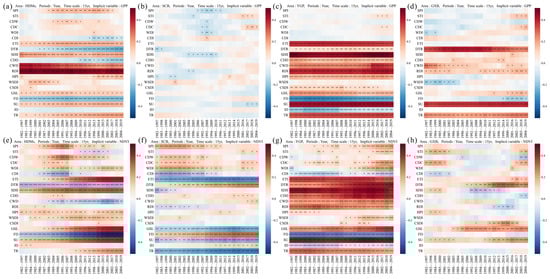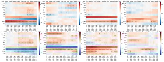 The temporal stability of the ETI (+), DTR (−), and CWD (+) during the growing season in the SWC was relatively high, with significant correlations with the GPP across the entire time series (Figure 5c). In the HDMs, the temporal stability of ECIs mirrored the overall temporal stability of their effects on EIs (Figure 7a). In contrast, the temporal stability of ECIs in the SCB was lower (Figure 7b). In the YGP, the ETI (+) and CWD (+) exhibited better temporal stability (Figure 7c), while in the GXB, the DTR (+) showed good temporal stability but only up to 2016 (Figure 7d). The NDVI during the growing season was influenced by a wide range of factors. The ETI (+) and DTR (−) displayed strong temporal stability, whereas other indices experienced gaps of 15 years or more (Figure 5d). The temporal stability of DTR (−) was better in the HDMs (Figure 7e), while in the SCB, the ETI (−) and DTR (+) were more temporally stable (Figure 7f). In the YGP, the ETI (+) showed greater temporal stability (Figure 7g).
