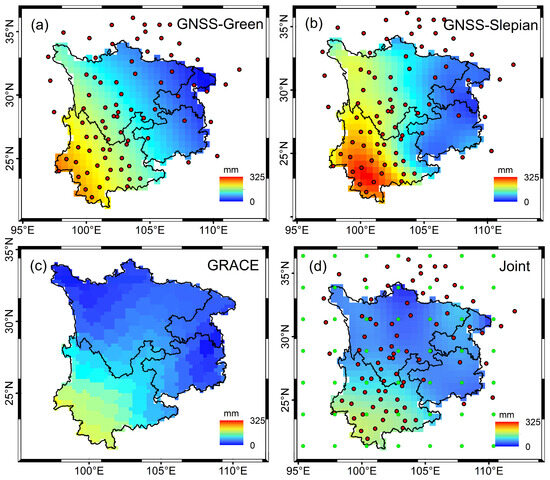- Jiang, Z.S.; Hsu, Y.J.; Yuan, L.G.; Yang, X.C.; Ding, Y.H.; Tang, M.; Chen, C.F. Characterizing spatiotemporal patterns of terrestrial water storage variations using GNSS vertical data in Sichuan, China. J. Geophys. Res. Solid Earth 2021, 126, e2021JB022398. [Google Scholar] [CrossRef]