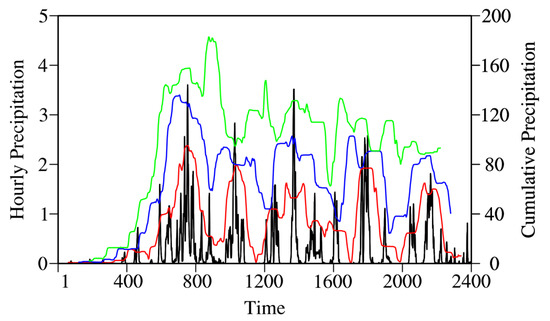 Temporal variation curves of regional average hourly and cumulative precipitation in Jiangxi Province. Black line represents hourly precipitation (mm); red, blue, and green lines represent 5-, 10-, and 15-day running average precipitation (mm), respectively.