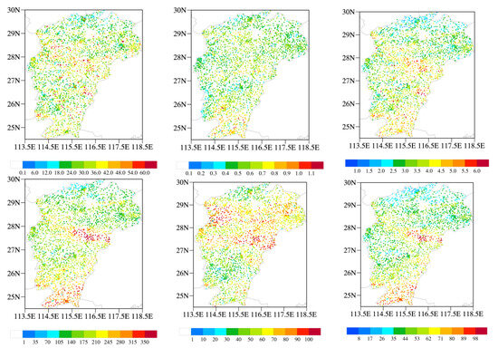 In order to better clarify the characteristics of precipitation observation data, the spatial distribution of the maximum, median, and variance of hourly precipitation observation data and hourly cumulative precipitation data used is presented here (Figure 2). The northern part of Jiangxi is predominantly flat, while the central and southern regions are characterized by hilly terrain. Influenced by the topography, stations with hourly precipitation exceeding 50 mm are primarily concentrated in the central area. The regions with high standard deviation values are situated in the central-eastern and southern parts, where extreme precipitation is more likely to occur. The median values across all stations in the province are predominantly clustered between 0.5 and 0.6 mm.