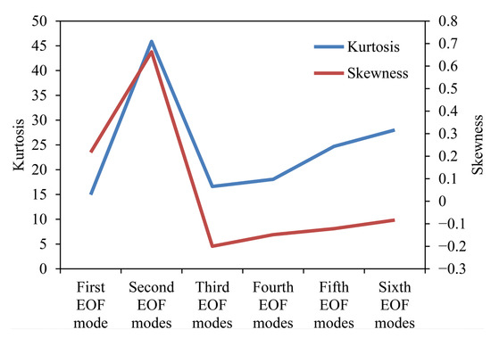 The skewness coefficient and the kurtosis coefficient are important metrics in statistics because they describe the symmetry and steepness or smoothness of a data distribution. As a special form of distribution, the normal distribution has specific values of skewness and kurtosis. Therefore, this study used these two statistical metrics to quantitatively analyze the frequency distribution of the high-order EOF modal reconstruction field. In recognition of the need to conduct multiple experiments to obtain the general pattern of the frequency distribution, in addition to the research period (10:00 on 9 March 2023 to 10:00 on 19 March 2023), two further periods were randomly selected for analysis: 10:00 on 4 March 2023 to 10:00 on 14 March 2023 and 10:00 on 14 March 2023 to 10:00 on 24 March 2023.