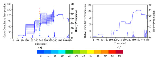 Time series of precipitation variation at each station in the idealized experiment and the actual QC, together with the removal of data points: (a) the idealized experiment and (b) the original data. Solid lines indicate the 10-day accumulated precipitation (mm), the dashed line shows the hourly precipitation (mm), and the hollow points represent the moments when data were rejected. In (a), the colored solid points indicate artificially added hourly precipitation values, and the solid lines show the 10-day accumulated precipitation curve with increments ranging from 5–60 mm.