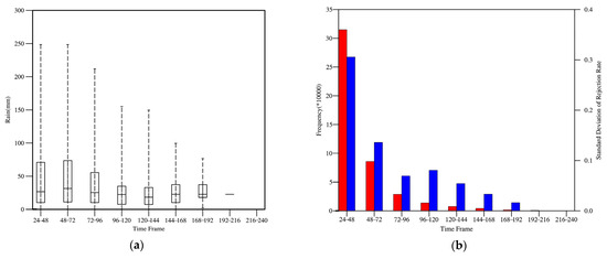 To establish a suitable threshold, this study statistically analyzed the distribution of excluded precipitation data within the study area at different thresholds (Figure 8a). It is evident that when the threshold is small, the excluded precipitation data exhibit a greater degree of extremism, and that the extreme value of precipitation gradually reduces as the threshold increases. The median value of the excluded precipitation data exhibits little change with the threshold, but from the distribution of the data, it is apparent that the excluded data tend to have similar characteristics as the threshold increases. Thus, it is evident that an ideal exclusion result can be obtained by setting a threshold, while also ensuring a stable exclusion rate. Therefore, the total frequency of data exclusion and the standard deviation of the rate of data exclusion over time for all stations within the study area with different thresholds set within 240 h were calculated (Figure 8b). It is evident that the overall trends of data exclusion frequency and the standard deviation decrease with the increase in the threshold, indicating that the rate of data exclusion will gradually decrease and become more stable over time as the threshold increases. The standard deviation of the frequency and rejection rate over time decreases rapidly in the threshold range of 24–72, and it slows markedly in the threshold range of 72–192. Owing to the stable and high rejection rate of the standard deviation of the frequency and rejection rate over time in the three ranges of 48–72, 72–96, and 96–120, the median of the two ranges is taken to find the threshold in the threshold range of 60–108.