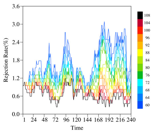 Variation of rejection rate with time (hour) for different thresholds represented by different colors.