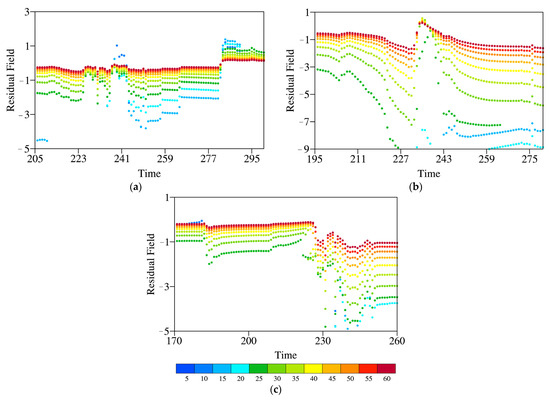 To visually demonstrate the effectiveness of this method, the distribution of the residual field during the period of concentrated removal of erroneous data in the ideal experiment is shown in Figure 10. It is evident that the residual field of the excluded data exhibits sudden changes in its temporal variation curve, such as at time 280 on the right-hand side of Figure 10a and at time 180 on the left-hand side of Figure 10c. Combined with the precipitation variation curve, it is apparent that these sudden changes occur when precipitation undergoes marked change in a short period. Moreover, as clearly shown in the figure, at the moment of introducing erroneous precipitation data, the residual field reached the extreme value level within the exclusion period. This reflects the strong basis of the proposed method: based on setting a threshold for judgment, combined with analysis of the time at which the residual field extremum appears, it is possible to more accurately identify the specific time when erroneous precipitation occurs.