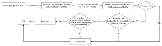 Since the introduction of the EOF quality control method, numerous meteorologists applied and improved it. Shao et al. [27] used ERA5 reanalysis data as the background field and established a surface temperature data quality control method suitable for high spatiotemporal density based on the EOF-based QC method. The method was tested in the central and eastern regions of China and yielded satisfactory results. Shen et al. [28] leveraging the EOF method for identifying anomalous observational data, proposed a data repair technique based on iterative EOF analysis. This technique effectively restores erroneous surface automatic station temperature observations. Building upon an analysis of the spatial scale and error distribution characteristics of surface temperature, Shang et al. [29] have established an EOF-based QC methodology for surface temperature observations that is entirely dependent on observational data. This approach is capable of accurately identifying erroneous observational data while effectively circumventing the impacts of background field errors, topographical influences, and local weather changes. Through the research and application of meteorologists, it has been proven that the EOF-based QC method can effectively avoid the influence of weather systems on precipitation data, providing new ideas for quality control of precipitation data.