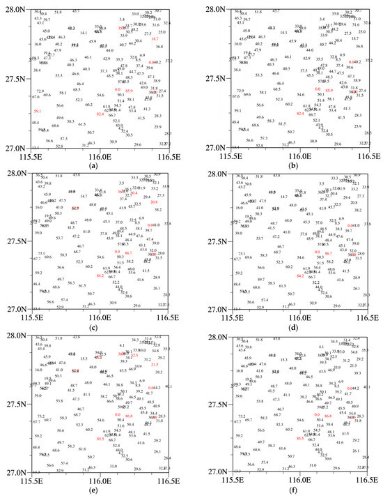 Owing to the lack of true values, to further clarify the accuracy of the new proposed QC method, an ideal experimental method was first used to evaluate the new QC method. This so-called ideal experiment refers to the addition of different levels of artificial error information to the observational data to test the capability of the new QC method in recognizing different levels of error. In conducting the ideal experiment, three stations were selected at random: station A (27.89°N, 116.26°E), station B (27.64°N, 114.01°E), and station C (27.35°N, 116.34°E). At 00:00 on 14 March 2023, artificial incorrect data were added to the hourly precipitation data of these three stations. Owing to the cumulative precipitation of 25–45 mm over the 10 days at that time, precipitation of 5–60 mm was added at equal intervals in the hourly precipitation data of these three stations and compared with the QC results of the original data. The precipitation trends and exclusion results of the three stations were similar; consequently, the results for station B were selected for display here. Comparison of Figure 7a,b reveals that the additional artificial erroneous disturbances can affect the 10-day cumulative precipitation data for 120 h before and after each time. It is evident from Figure 7a that at 00:00 on 14 March 2023 (coordinate 230 in the figure), when the disturbance precipitation increased to 15 mm, there was a continuous exclusion phenomenon during the period of coordinates 230–290 in the figure. However, at 25 mm, the 10-day cumulative precipitation data showed a continuous exclusion phenomenon during the period of coordinates 200–300 in the figure, indicating that the exclusion results tended to stabilize from 25 mm onward. However, in the original observation data (Figure 7b), there was no phenomenon of exclusion around that time, indicating that the data began to exhibit exclusion when the disturbance precipitation approached the original 10-day cumulative precipitation data. When the disturbance reached or exceeded the original data time, the exclusion began to stabilize.