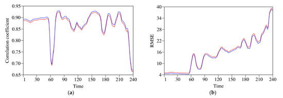 Variation in (a) the spatial correlation coefficient and (b) the root mean square error (RMSE) with observation time between the CMPAS data and the observations before (red) and after (blue) QC.