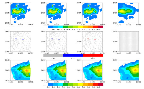 To verify whether this method can effectively retain accurate local heavy precipitation data, the hourly precipitation data at 18:00 on 21 May 2023 and the radar echoes covering short-term heavy precipitation generated during this period are shown in Figure 15. It is evident that strong echoes of >55 dBZ existed in the area 26.3–26.5°N, 116.3–116.5°E, and that these echoes were stable and nearly stationary, resulting in short-term heavy precipitation with localized rainfall intensity of over 80 mm/h. When the Tianqing QC system detected this short-term heavy rainfall, it was adjudged incorrect data, and then manually verified and reassessed as correct. However, the EOF-based QC method effectively extracts information from small- and medium-sized weather systems, resulting in the retention of such data.