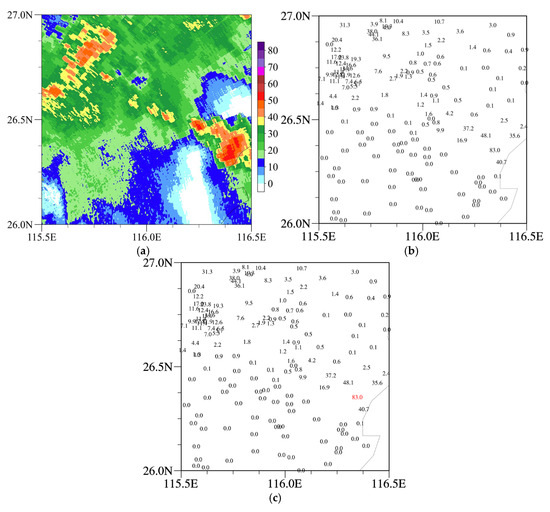 Spatial distribution of (a) the reflectivity of the Ganzhou radar, and precipitation data (mm) at 18:00 on 21 May 2023 after QC via (b) the new QC method and (c) the Tianqing QC method. Red numbers represent excluded data.
