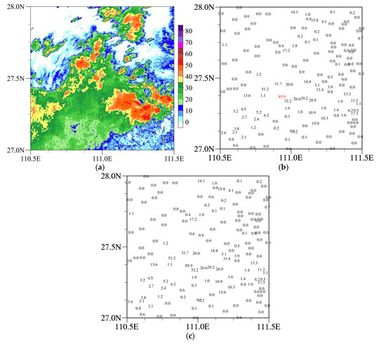 Spatial distribution of (a) the reflectivity of the Shaoyang radar, and precipitation data (mm) at 10:00 on 11 August 2024 after QC via (b) the new QC method and (c) the Tianqing QC method. Red numbers represent excluded data.