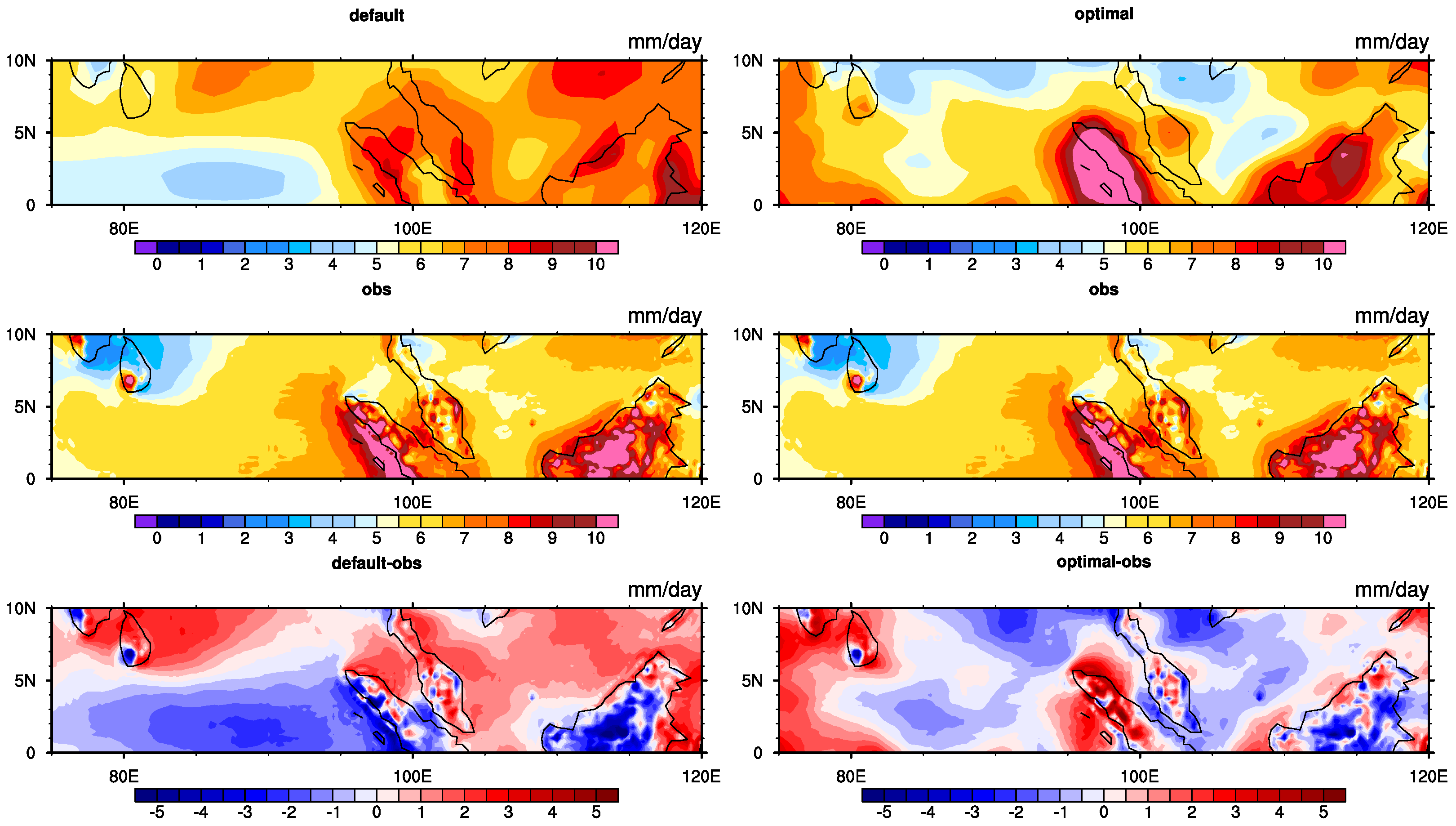 Figure 10b. Furthermore, the problem of negative precipitation bias in the default simulation over Sulawesi Island (near