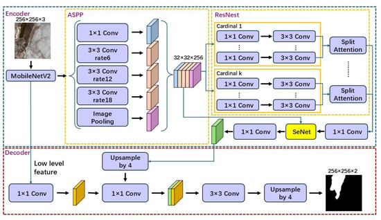 Overall architecture of the RST-DeepLabv3+ model. We incorporated a multi-attention module into DeepLabv3+ to dynamically reallocate weights across different channels.