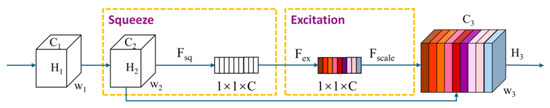 The SENet module is mainly divided into two components: squeeze-and-excitation, as well as scale. In the squeeze operation, Fsq applies global average pooling across channels, reducing the × × feature map with a global context into a 1 × 1 × vector. This is performed to transform each two-dimensional channel into a numerical value that captures the global sensing characteristics. In this case, each pixel represents a single channel, shielding the spatial distribution information and better utilizing the correlation between the channels. The formula used is as follows: