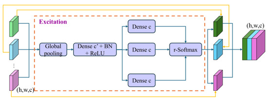 The computation of attention involves summarizing the features of each branch and then obtaining global information through a global pooling (squeezing) operation. This information is then sent to a series of fully connected layers, from which the attention weights for each branch are computed. The input feature maps in Figure 3 were subjected to attention computation after excitation and weighted superposition; therefore, the final output was not consistent with the color depth of the input feature maps. The formula is as follows: