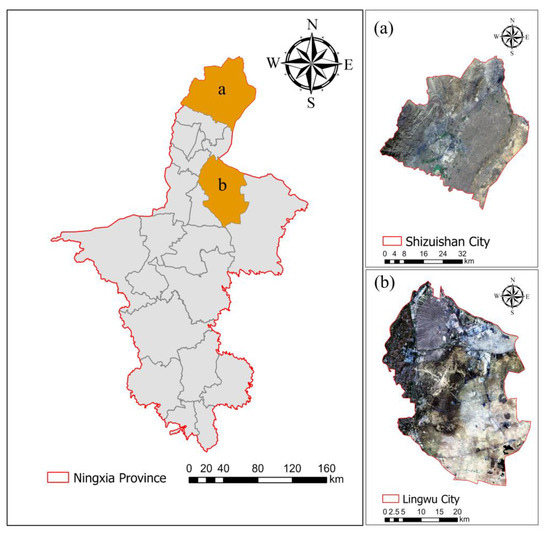 The study area was located in Lingwu City, Ningxia Province (106°28′–106°47′, 37°54′–38°4′), with mines primarily situated in the areas of Nindong, Jieyaobao, Qingshuiying, Majiatan, and Shigouyi, and an annual coal production of 58,946,000 tons. In particular, coal ore mining has led to the creation of thousands of tailings ponds (Figure 4). The images of Lingwu City (Figure 4a) and Shizuishan City (Figure 4b) in Figure 4 are from the Sentinel-2 image.