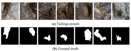 This changed when Zhang et al. [25] developed the TPSet semantic segmentation dataset for tailings ponds by visually interpreting GF-6 panchromatic multispectral scanner (PMS) images. The training and validation sets of the TPSet dataset consist of 1389 images, each with corresponding binary mask files, all with a size of 512 × 512 pixels. The test set contains 3564 images and corresponding binary mask files, each with a size of 512 × 512 pixels, completing the missing dataset.