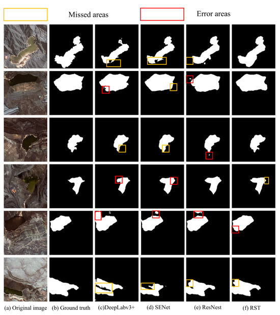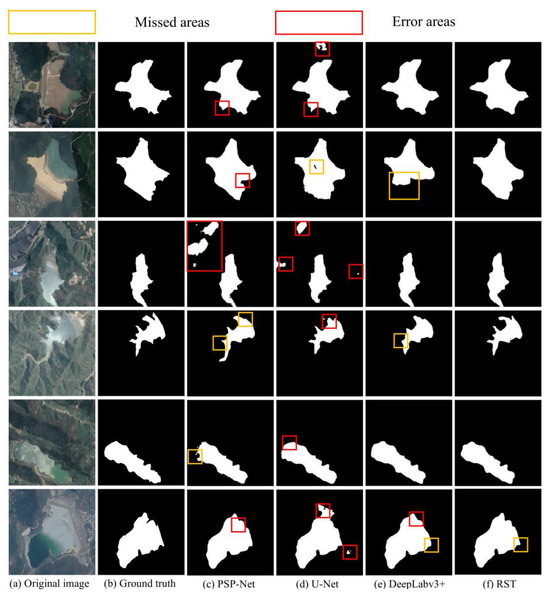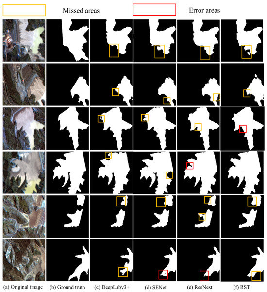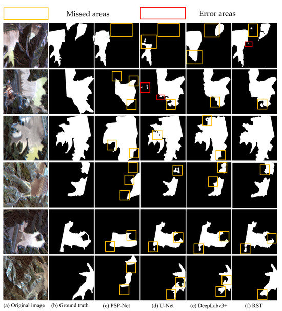 Comparison of experimental results on the TPSet semantic segmentation datasets. (a) is listed as the original image, (b) is listed as ground truth, (c) is listed as PSP-Net, (d) is listed as U-Net, (e) is listed as DeepLabv3+, and (f) is listed as RST-DeepLabv3+. Orange rectangles are missed areas; red rectangles are error areas.